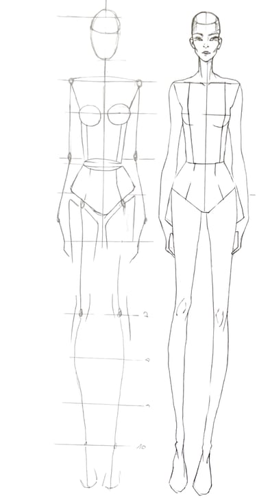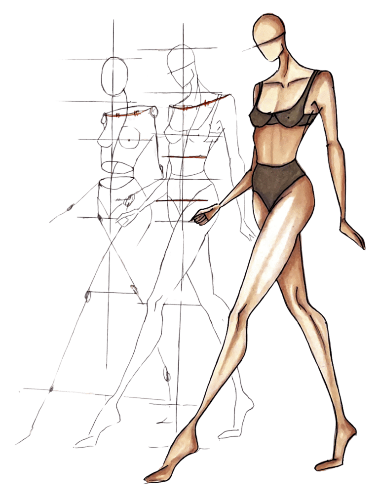 In lesson 2, we'll look at how to draw and colour a fashion silhouette of a woman in motion, following the proportions we saw in lesson 1. To complete the lesson, we will create a lingerie set.